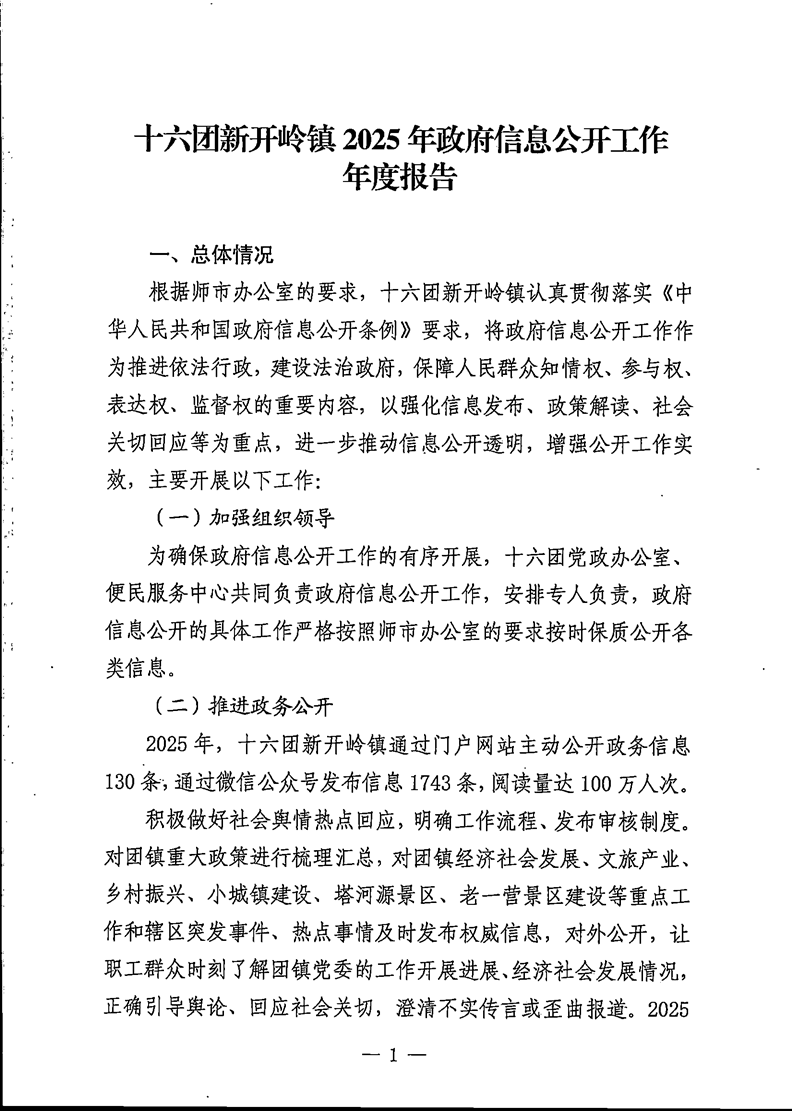 十六团新开岭镇2025年政府信息公开工作年度报告