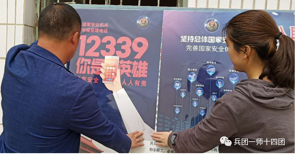 十四团七连党支部组织“两委”成员共同学习《习近平关于总体国家安全观论述摘编》、《全面提高依法防控依法治理能力,健全国家公共卫生应急管理体系》等内容,通过宣传海报、“两委”成员深入职工家庭宣传等方式,向广大职工普及法律知识,努力提升职工群众的国家安全意识。