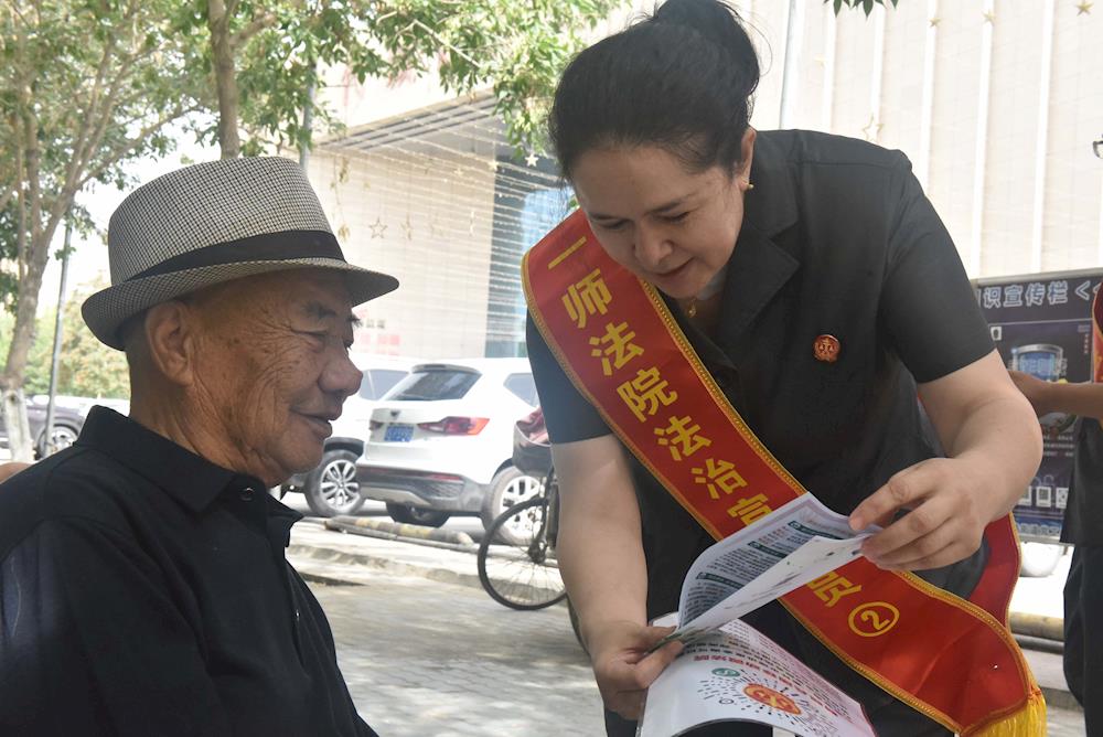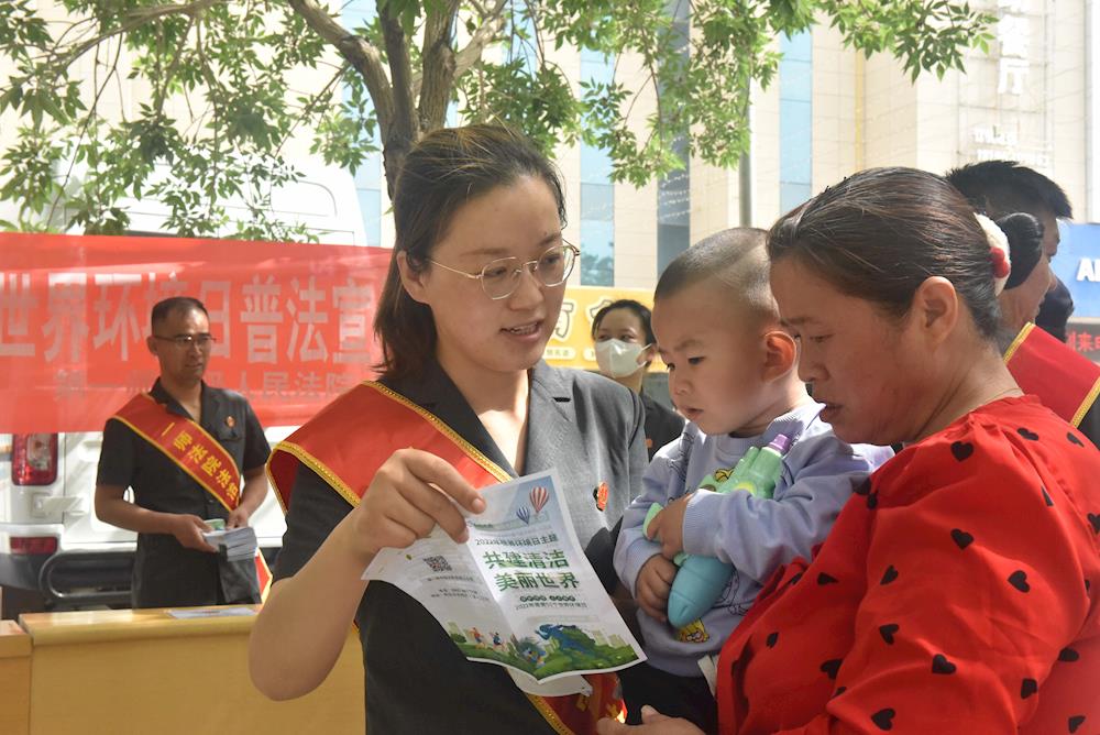6月5日,第一师中级人民法院联合阿拉尔垦区人民法院,在阿拉尔市时代广场开展了“保护生态环境 共建绿色家园”普法宣传活动。活动现场,干警们围绕“建设人与自然和谐共生的现代化”的主题,通过悬挂宣传横幅、设置法律咨询台、发放环境保护宣传彩页等形式,向职工群众普及与环境保护有关的垃圾分类、节约用水、用电、绿色出行、“减塑捡塑”等环境保护小知识,有效引导群众树立尊重自然、保护自然的环保理念,自觉践行简约适度、绿色低碳、文明健康的生活理念和生活方式。