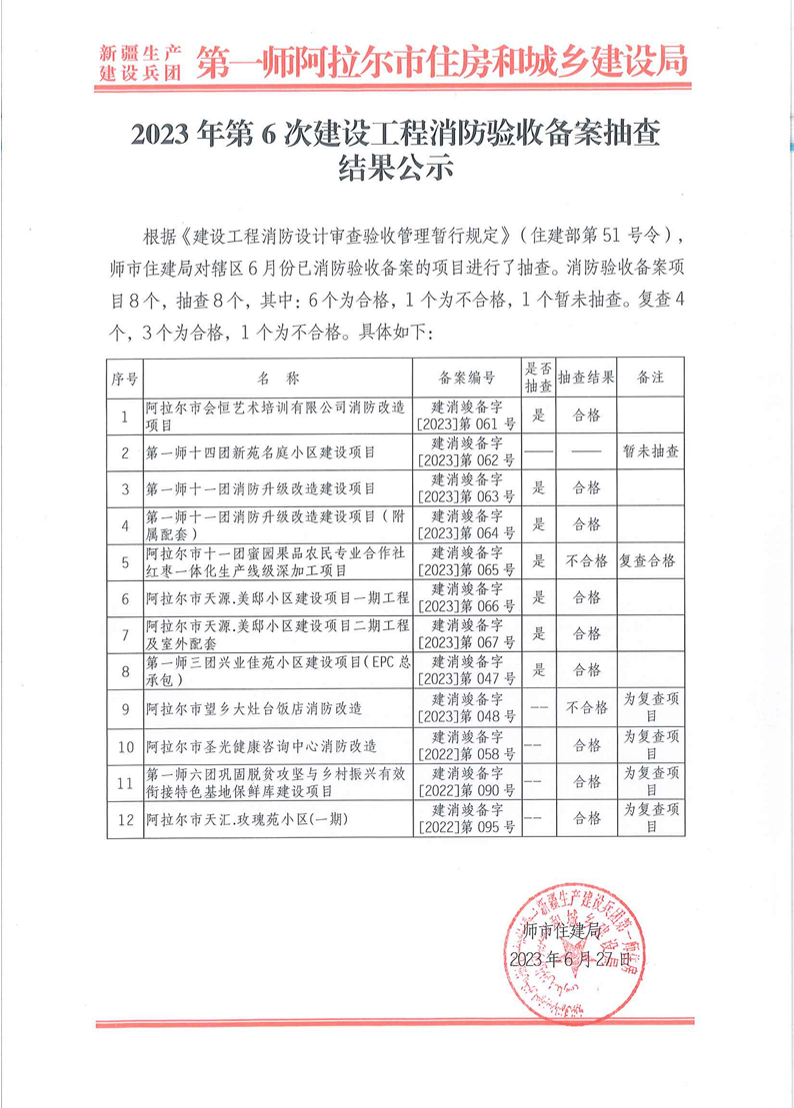 2023年第6次建设工程消防验收备案抽查结果公示