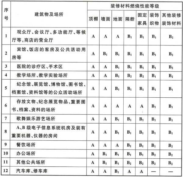5.2.1 本条为强制性条文。表5.2.1中建筑物类别、场所及建筑规模是根据现行国家标准《建筑设计防火规范》GB 50016有关内容结合室内设计情况划分的。其内部装修材料防火等级强制执行,以规范高层民用建筑的材料使用,减少火灾发生。