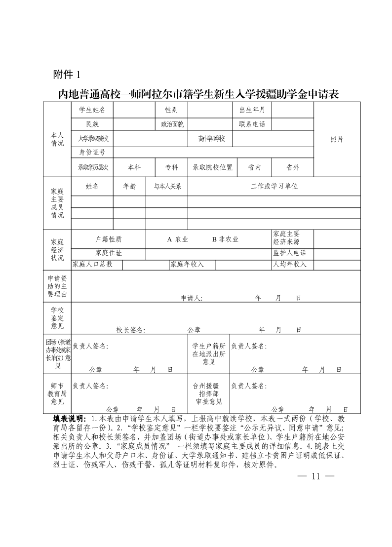 附件:1.内地普通高校一师阿拉尔市籍学生新生入学援疆助学金申请表