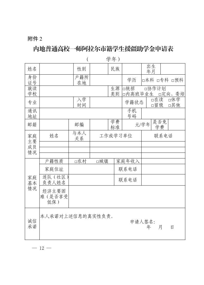 2.内地普通高校一师阿拉尔市籍学生援疆助学金申请表