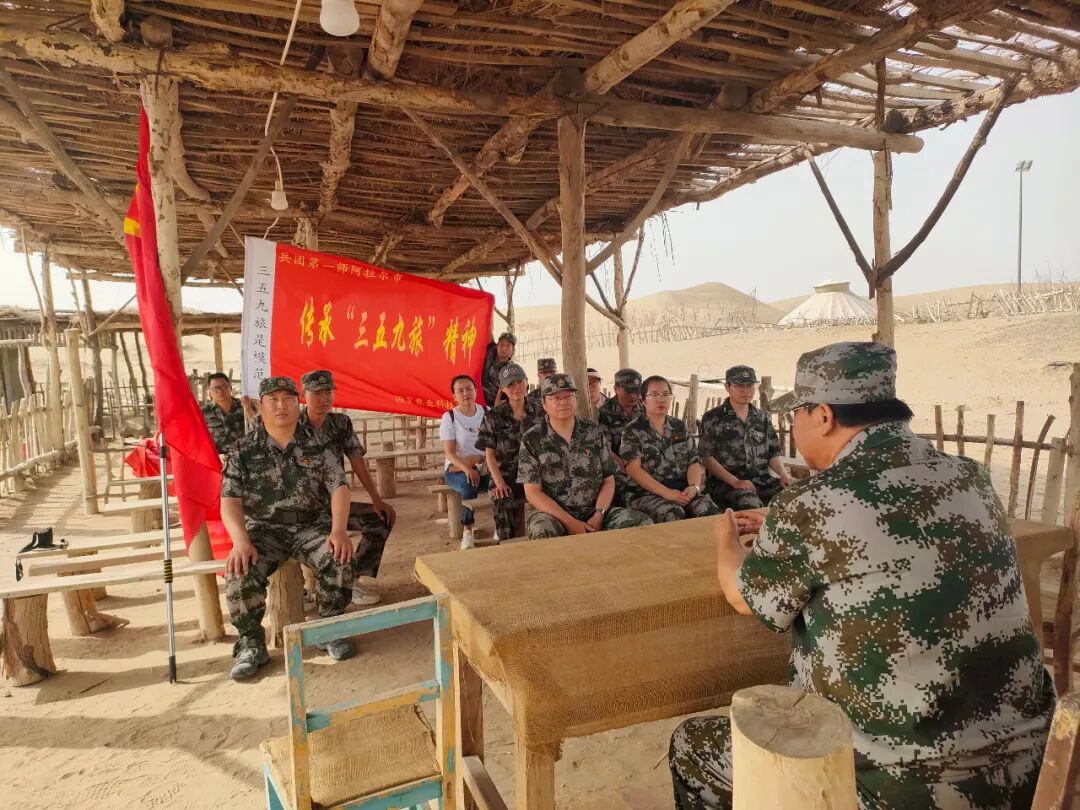 随后,全体党员整齐列队,怀着崇敬之心走向塔克拉玛干沙漠,重走革命先辈的足迹,党员们带着思考走,带着感恩走,体会路途的不易,感受革命事业的艰辛。党员们还合唱了《兵团进行时》、《没有共产党就没有新中国》,用激昂的歌声传达了传承三五九旅精神的誓言。