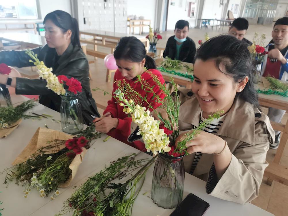 活动现场,社区工作人员为员工分发花束,给大家讲授插花知识,从花材、容器、色彩搭配等方面,详细介绍了插花的艺术造型要素和技巧手法,并在现场做了演示。活动现场花香四溢,充满着春天的气息,大家兴趣盎然,边看边学,享受着亲自创作的乐趣和插花艺术带来的快乐。一瓶瓶色彩鲜艳、造型各异的插花作品寄托着大家对美的理解和对幸福的感悟。