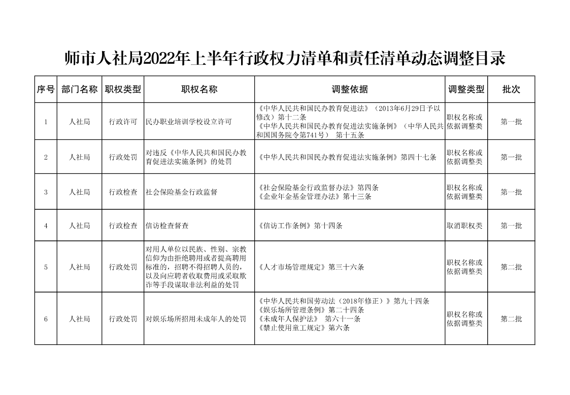 师市人社局2022年上半年行政权力清单和责任清单动态调整目录