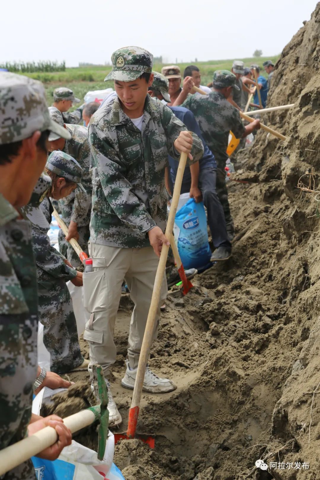在一条新筑起的堤坝上,九团十八连民兵刘磊告诉记者:“29日凌晨6时我们接到民兵集结命令,要对这条已筑好的大坝进行巡视维护,防止汛情再次发生。我将坚守到下一批抢险人员到来,人在坝在,坚决保证人民群众的生命财产安全。”