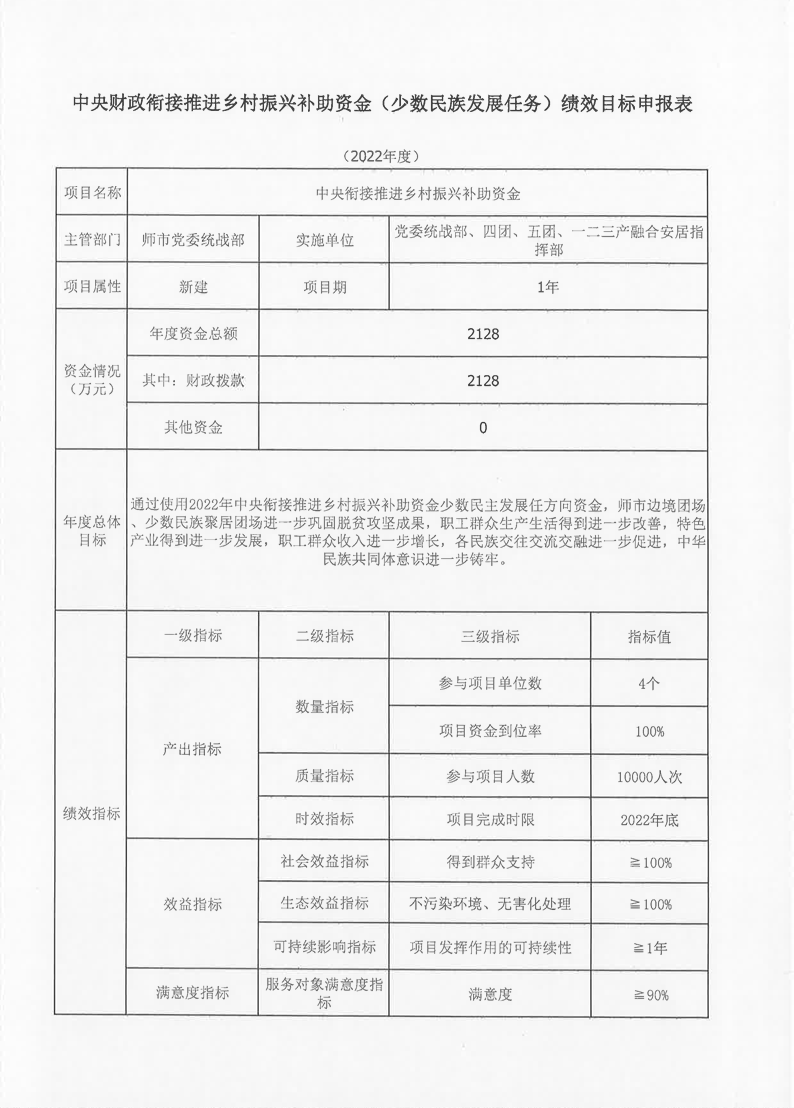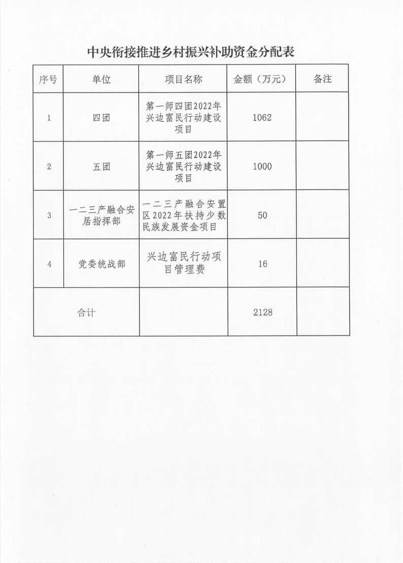 根据《关于下达2022年中央财政衔接推进乡村振兴补助资金(少数民族发展任务)的通知》(兵财弄〔2022〕21号)文件精神,经部务会研究,项目评审会审议,现将第一师阿拉尔市兴边富民行动项目补助资金、扶持少数民族发展资金分配方案公示如下: