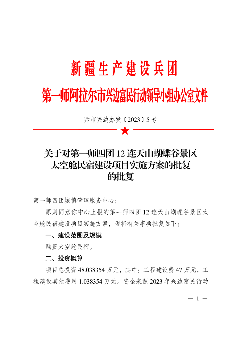 师市兴边组办发[2023]5号 第一师四团12连天山蝴蝶谷景区太空舱民宿建设项目实施方案的批复