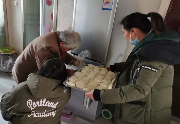 下午4点钟,桃源社区幸福花园网格党支部党员群众和驻区单位党员在网格党支部活动室内,在桌子拼凑成的临时桌面上,大家有的和面、有的洗菜、有的调馅、擀饺子皮、包饺子,个个动作熟练。大家一边包着饺子一边唠着家常,浓浓邻里情随着饺子馅的阵阵香味弥漫在节日气氛中。不一会儿工夫,面前的盘子里就放满了饺子。