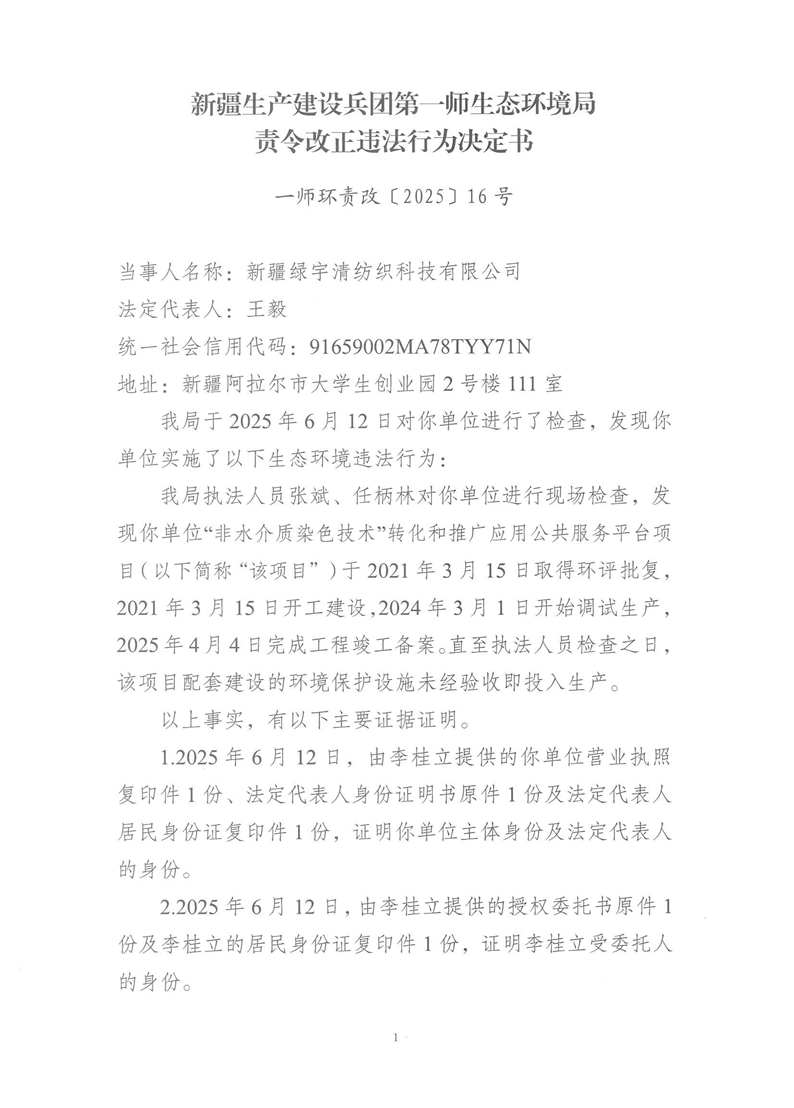 纺织科技有限公司《责令改正违法行为决定书》16号的公示