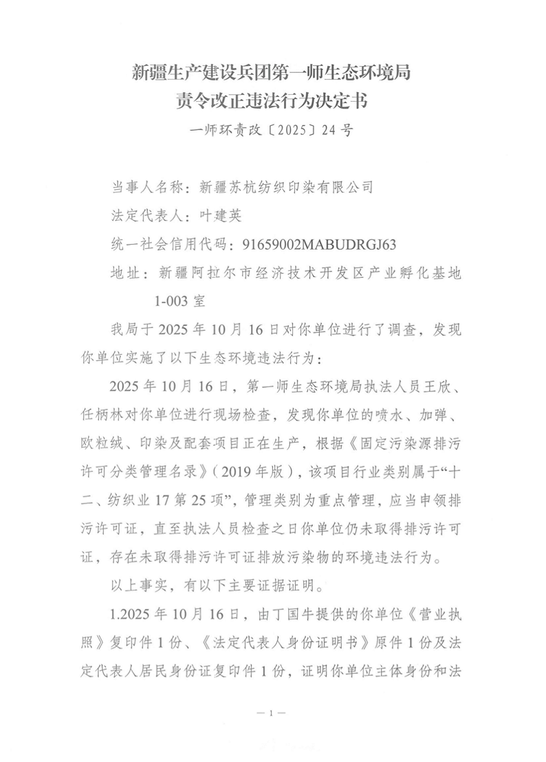 关于新疆苏杭纺织印染有限公司《责令改正违法行为决定书》的公示