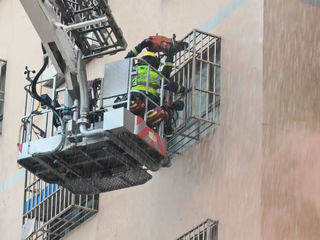 11时40分,阿拉尔市消防救援大队举高喷射车、登高平台车相继抵达。现场侦察显示,504室火焰窜出窗口,两名被困者困于阳台防护窗内,楼梯间浓烟封锁内攻通道。“启动外部救援!”指挥长果断下令。