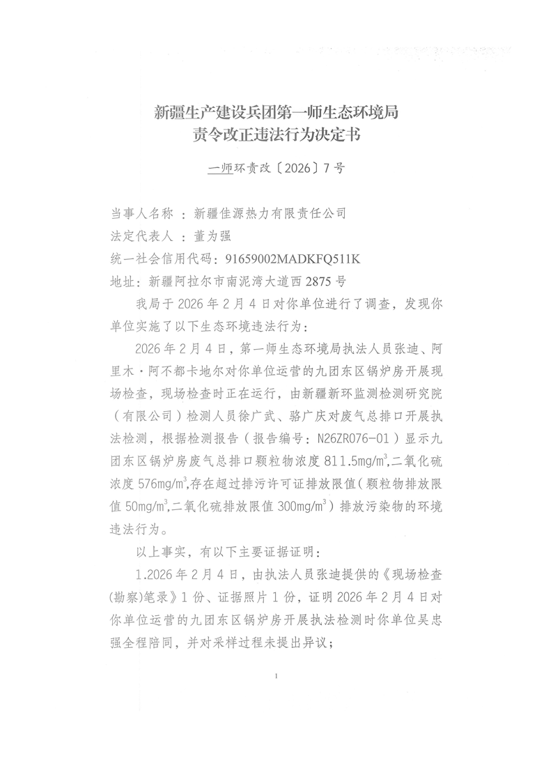 关于新疆佳源热力有限责任公司《责令改正违法行为决定书》一师环责改〔2026〕7号的公示 来源: 发布时间:2026-03-11 13:23:15 浏览次数: 次 【字体:小 大】 终审:生态环境局 【打印正文】