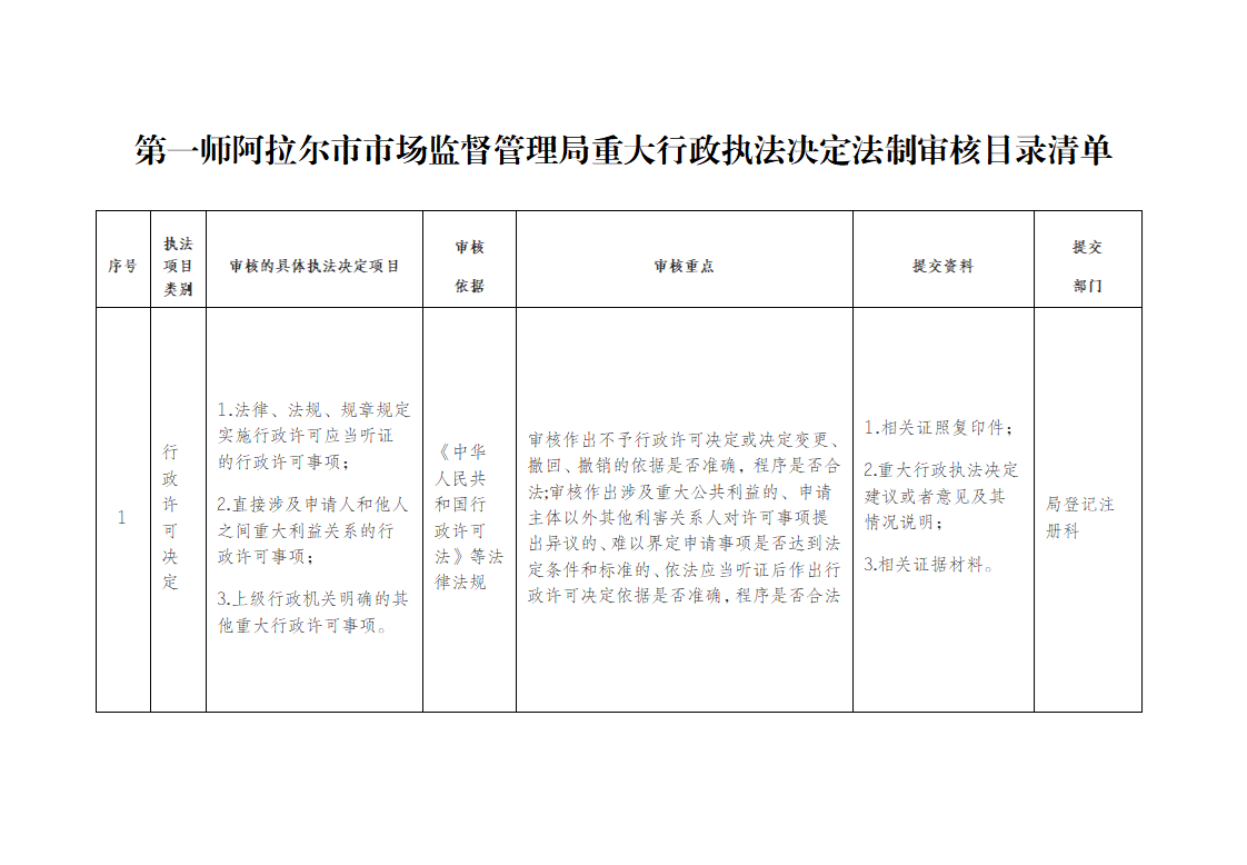 第一师阿拉尔市市场监督管理局重大执行决定法制审核目录清单