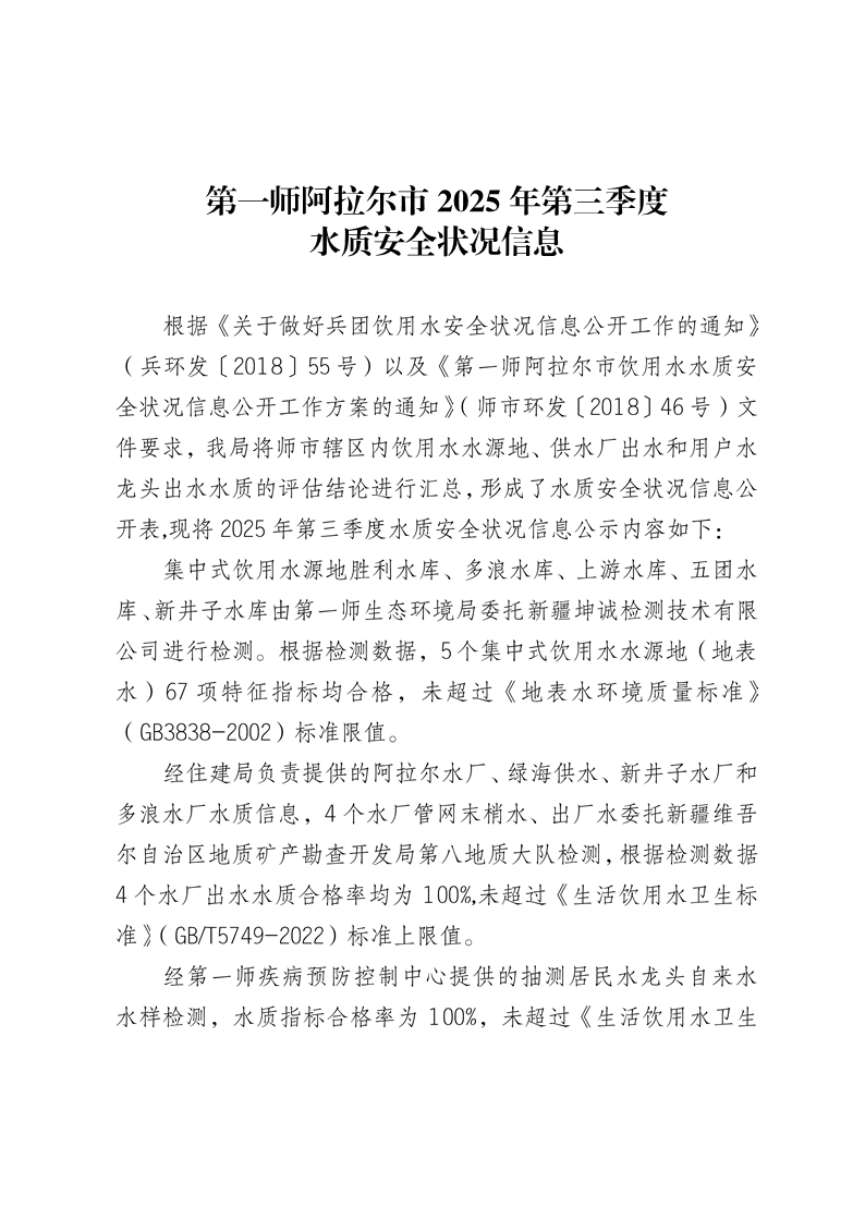 第一师阿拉尔市2025年第三季度饮用水水质公开