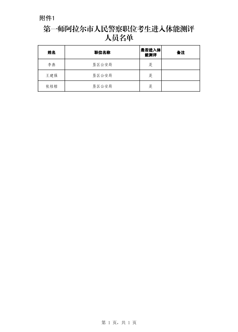 1.报考第一师阿拉尔市人民警察职位考生进入体能测评人员名单(详见附件1)。