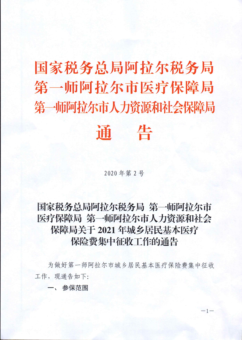 国家税务总局阿拉尔税务局 第一师阿拉尔市医疗保障局 第一师阿拉尔市人力资源和社会保障局关于2021年城乡居民基本医疗和社会保险费集中征收工作的通告 来源:国家税务总局阿拉尔税务局 发布时间:2020-08-13 16:37:15 浏览次数: 次 【字体:小 大】 终审:国家税务总局阿拉尔税务局 【打印正文】