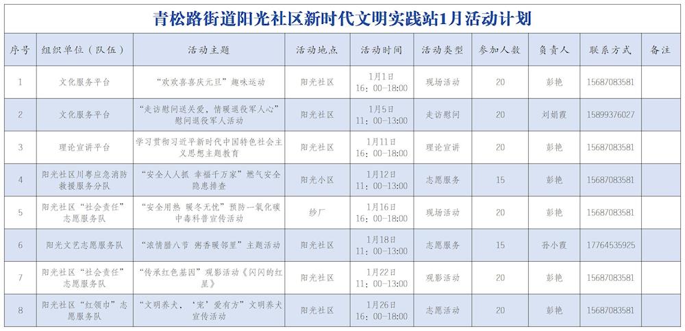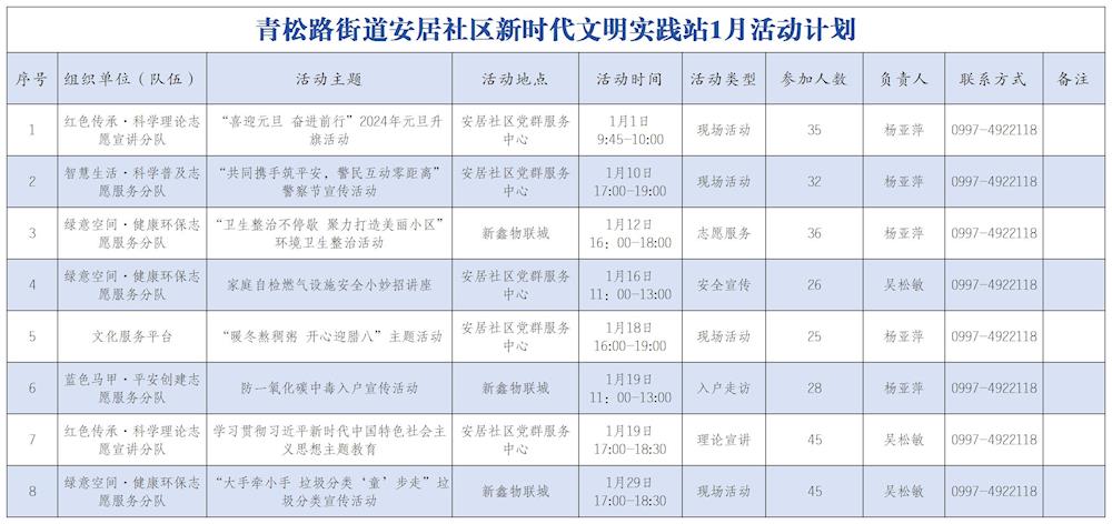 新时代文明实践 | 青松路街道新时代文明实践1月活动计划来啦~ 来源: 发布时间:2024-01-02 16:18:54 浏览次数: 次 【字体:小 大】 为深入开展新时代文明实践活动,进一步服务群众、便利群众,把文明实践活动送到群众的家门口,结合群众需求,青松路街道新时代文明实践所、站策划了一系列丰富多彩的活动,2024年1月活动计划已新鲜已出炉,一起来看看吧~ 终审:青松路街道办 【打印正文】