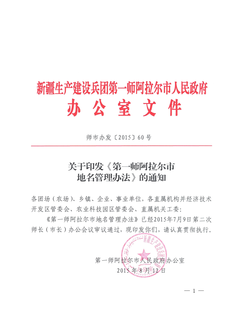关于印发《第一师阿拉尔市地名管理办法》的通知