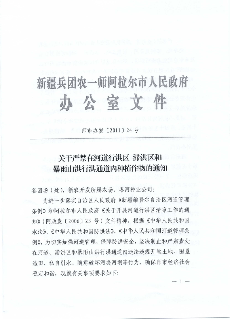 关于严禁在河道行洪区滞洪区和暴雨山洪行洪通道内种植作物的通知(师市办发〔2011〕24号) 来源: 发布时间:2023-08-07 10:36:10 浏览次数: 次 【字体:小 大】 终审:水利局 【打印正文】