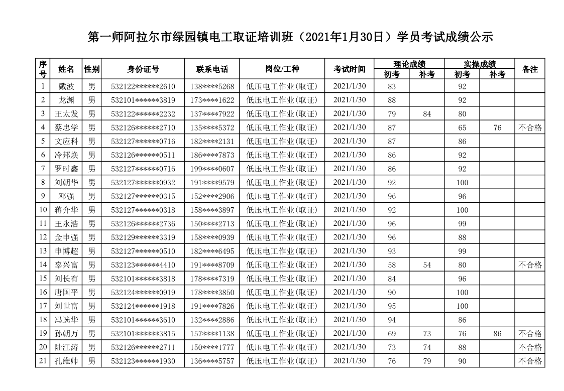 第一师阿拉尔市绿园镇低压电工取证培训(2021年1月30日)考试成绩公示
