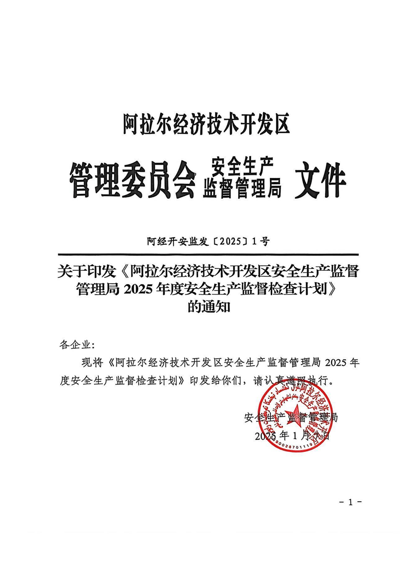 阿拉尔经济技术开发区安全生产监督管理局安全生产监督检查计划